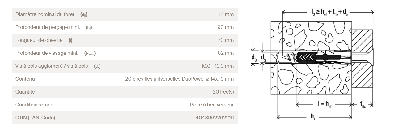 Cheville DuoPower 14x70 / Boite de 20 - FISCHER - 538254